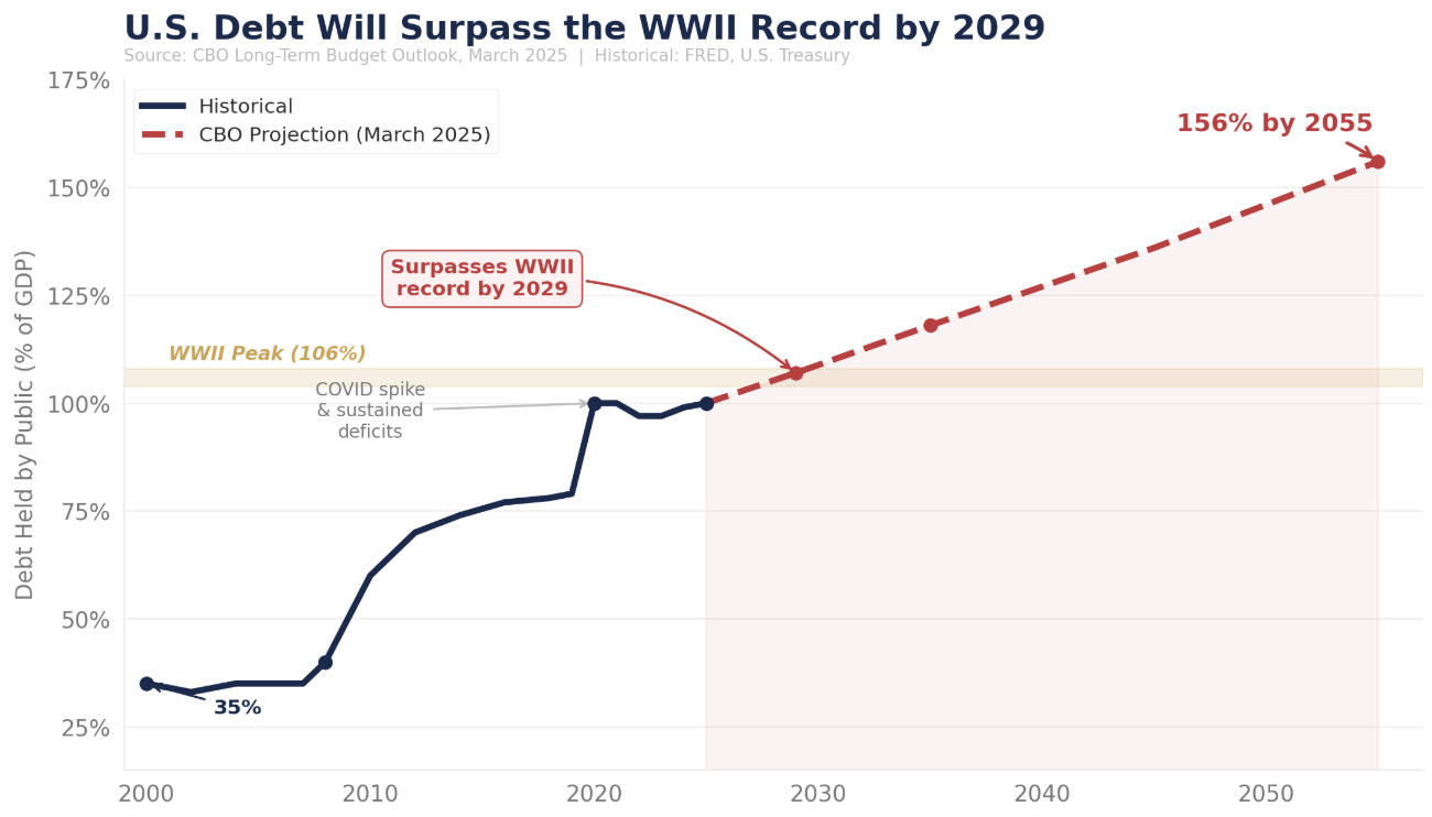 The CBO projects debt will surpass the World War II record by 2029, reaching 156% of GDP by 2055. Total unfunded social insurance obligations jumped to $88.4 trillion last year, an increase of $10.1 trillion in a single year. Social Security’s trust fund depletes in 2033. After that, it pays 77 cents on the dollar.